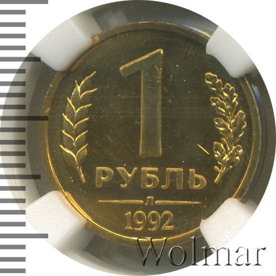 В центре немного смещенная вверх цифра «1» обозначающая номинал монеты, ниже слово «РУБЛЬ», под ним буквенное обозначение монетного двора «Л» (ЛМД). Внизу у края монеты год выпуска «1992». Слева колос, справа дубовая ветвь.