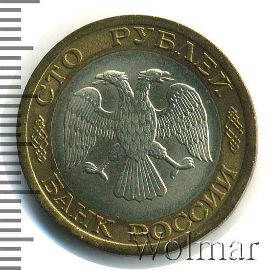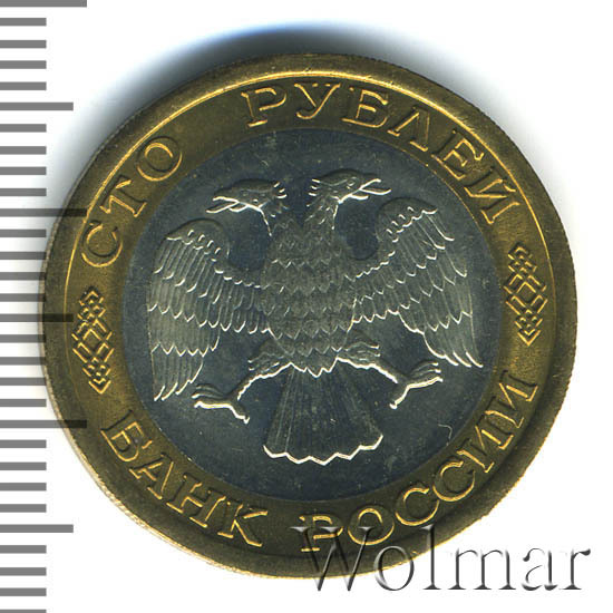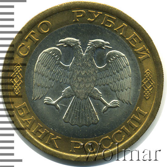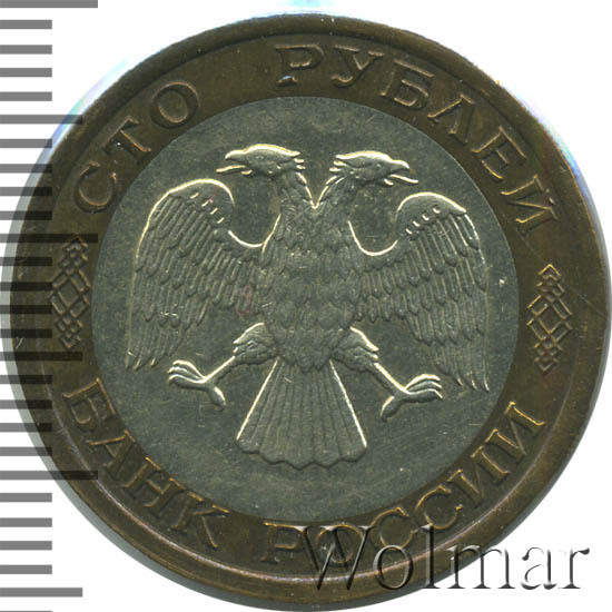 Вверху вдоль канта обозначение достоинства монеты «СТО РУБЛЕЙ» ниже справа и слева орнамент, внизу надпись «БАНК РОССИИ», в середине двуглавый орел с опущенными крыльями, перья с просечками.