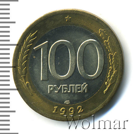 Сверху пятиконечная звезда, в центре немного смещенная вверх цифра «100» обозначающая номинал монеты, ниже слово «РУБЛЕЙ», под ним монограмма монетного двора (ЛМД). Внизу у края монеты год выпуска «1992». Слева колос, справа дубовая ветвь.