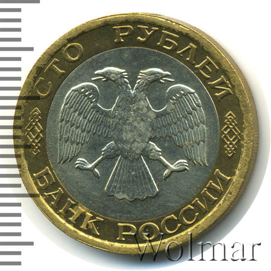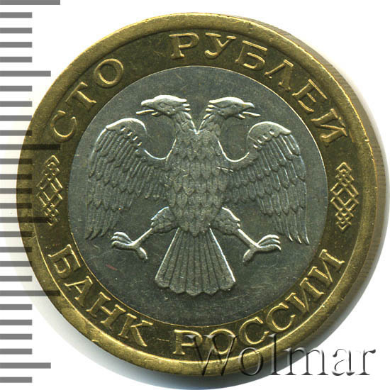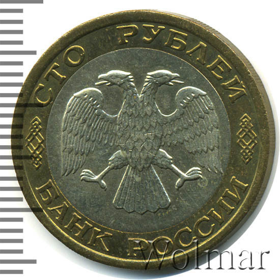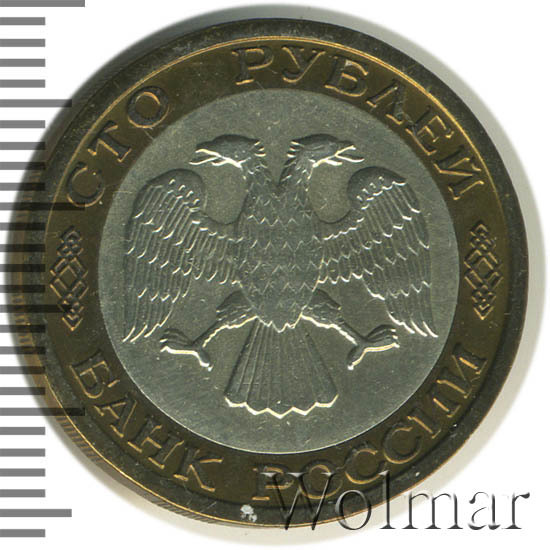 Вверху вдоль канта обозначение достоинства монеты «СТО РУБЛЕЙ» ниже справа и слева орнамент, внизу надпись «БАНК РОССИИ», в середине двуглавый орел с опущенными крыльями, перья без просечек.