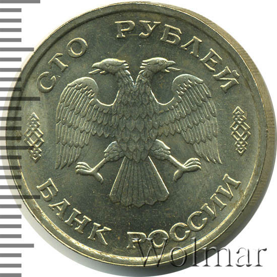 Вверху вдоль канта обозначение достоинства монеты «СТО РУБЛЕЙ» ниже справа и слева орнамент, внизу надпись «БАНК РОССИИ», в середине двуглавый орел с опущенными крыльями, перья с просечками.