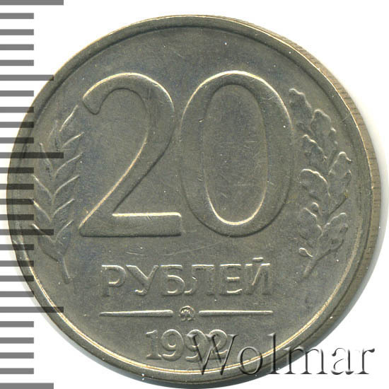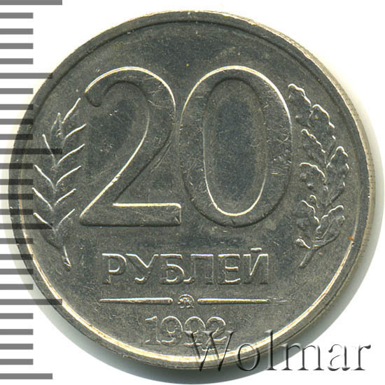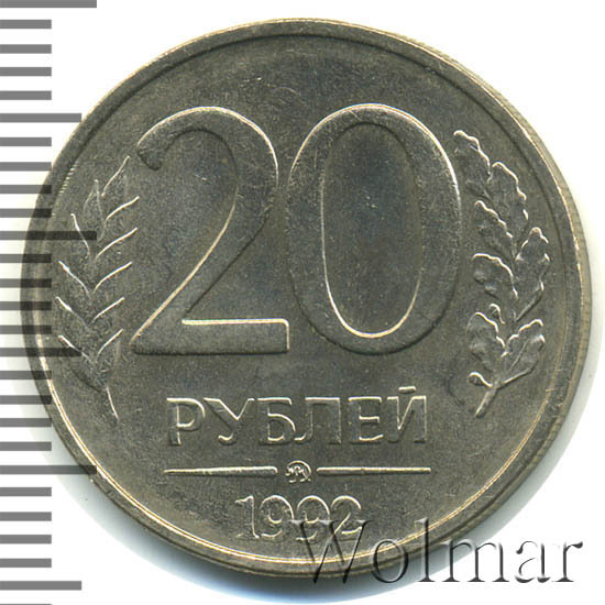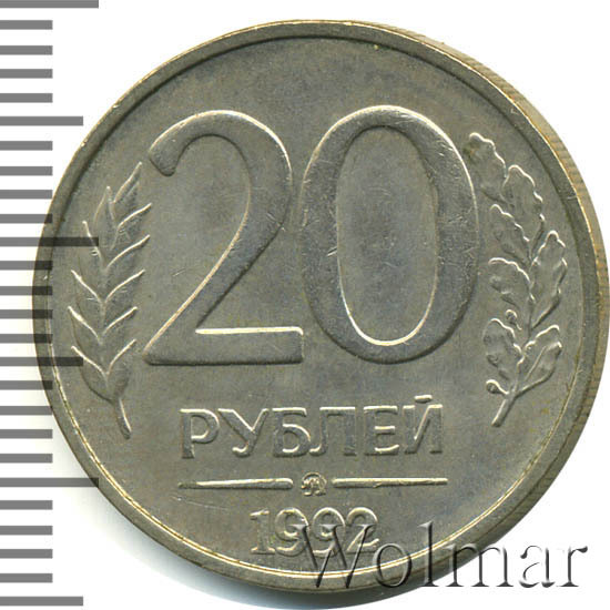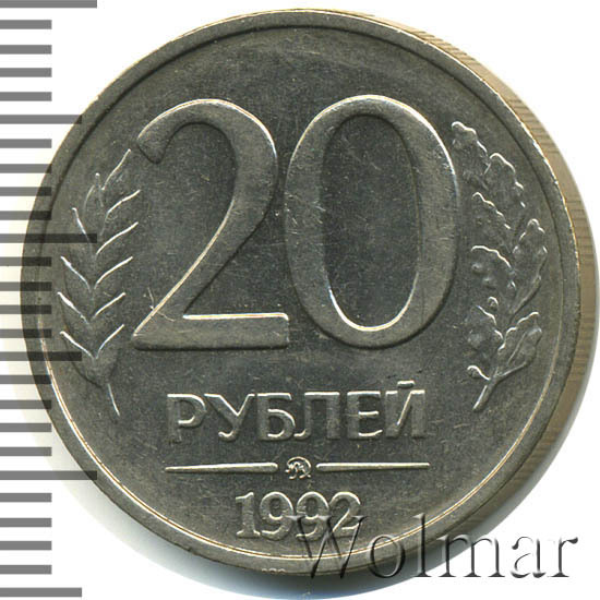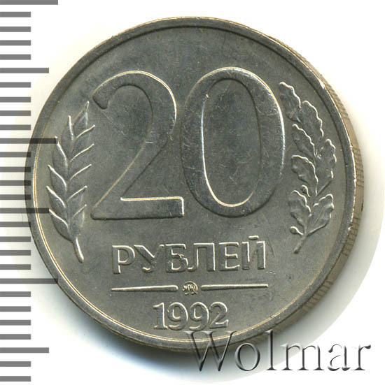 В центре немного смещенная вверх цифра «20» обозначающая номинал монеты, ниже слово «РУБЛЕЙ», под ним монограмма монетного двора (ММД). Внизу у края монеты год выпуска «1992». Слева колос, справа дубовая ветвь.