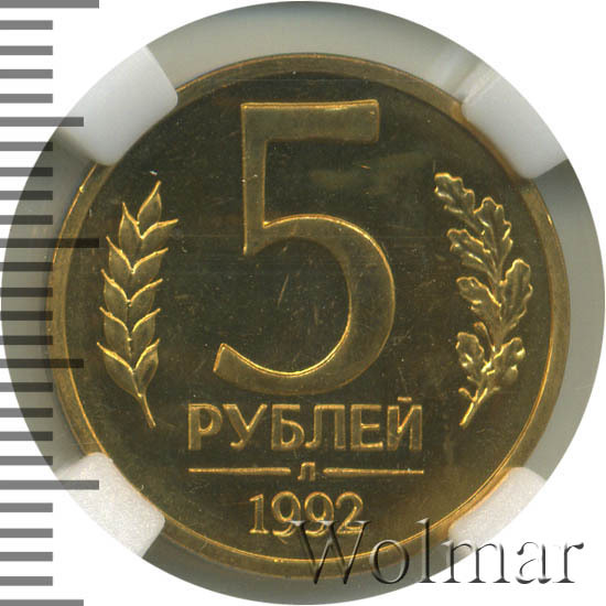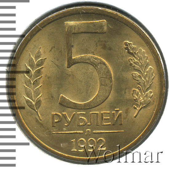 В центре немного смещенная вверх цифра «5» обозначающая номинал монеты, ниже слово «РУБЛЕЙ», под ним буквенное обозначение монетного двора «Л» (ЛМД). Внизу у края монеты год выпуска «1992». Слева колос, справа дубовая ветвь.