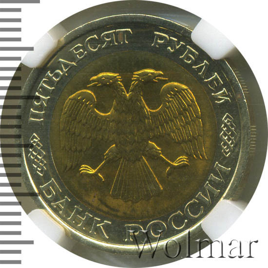 Вверху вдоль канта обозначение достоинства монеты «ПЯТЬДЕСЯТ РУБЛЕЙ» ниже справа и слева орнамент, внизу надпись «БАНК РОССИИ», в середине двуглавый орел с опущенными крыльями, перья с просечками.