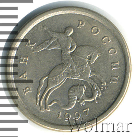 Слева вдоль выступающего канта слово «БАНК», справа «РОССИИ», внизу год выпуска «1997», в центре Георгий Победоносец колющий копьем змея, под передней ногой коня буквенное обозначение монетного двора «С-П» (СПМД).