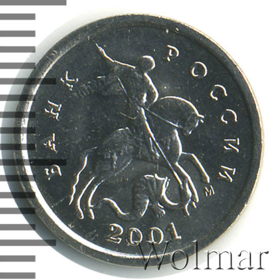 Слева вдоль выступающего канта слово «БАНК», справа «РОССИИ», внизу год выпуска «2001», в центре Георгий Победоносец колющий копьем змея, под передней ногой коня буквенное обозначение монетного двора «М» (ММД).