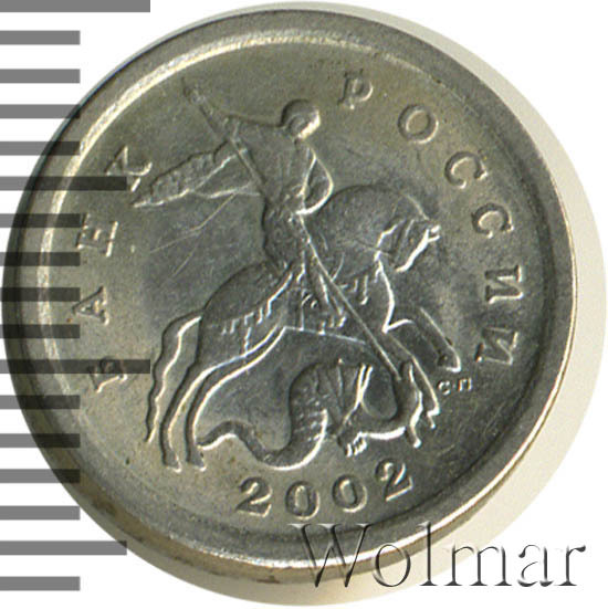Слева вдоль выступающего канта слово «БАНК», справа «РОССИИ», внизу год выпуска «2002», в центре Георгий Победоносец колющий копьем змея, под передней ногой коня буквенное обозначение монетного двора «С-П» (СПМД).