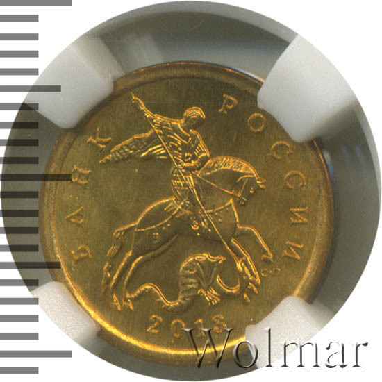 Слева вдоль выступающего канта слово «БАНК», справа «РОССИИ», внизу год выпуска «2013», в центре Георгий Победоносец колющий копьем змея, под передней ногой коня буквенное обозначение монетного двора «С-П» (СПМД).