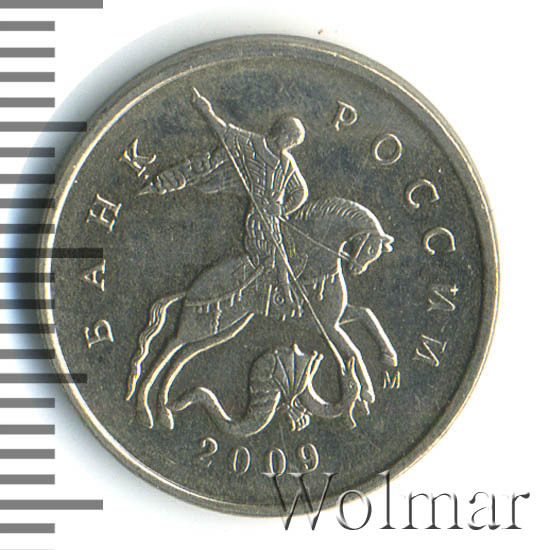 Слева вдоль выступающего канта слово «БАНК», справа «РОССИИ», внизу год выпуска «2009», в центре Георгий Победоносец колющий копьем змея, под передней ногой коня буквенное обозначение монетного двора «М» (ММД).