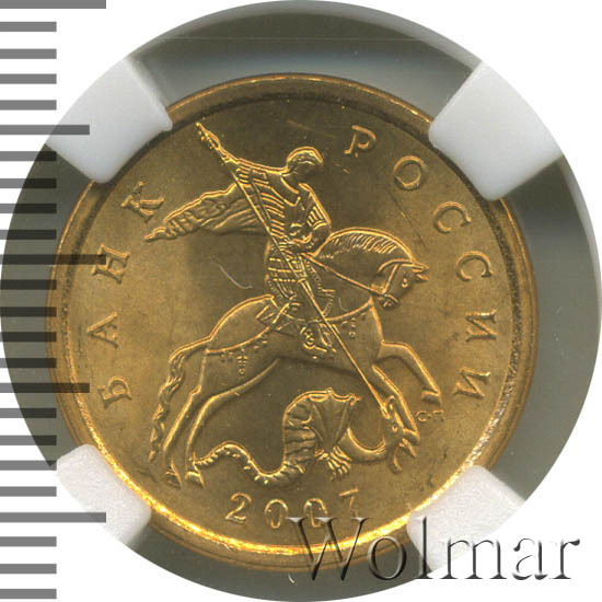 Слева вдоль выступающего канта слово «БАНК», справа «РОССИИ», внизу год выпуска «2007», в центре Георгий Победоносец колющий копьем змея, под передней ногой коня буквенное обозначение монетного двора «С-П» (СПМД).