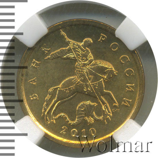Слева вдоль выступающего канта слово «БАНК», справа «РОССИИ», внизу год выпуска «2010», в центре Георгий Победоносец колющий копьем змея, под передней ногой коня буквенное обозначение монетного двора «С-П» (СПМД).