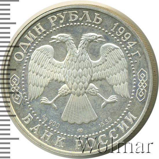 Вверху вдоль канта номинал «1 рубль» и год выпуска «1994 г.», внизу слова «БАНК РОССИИ». В середине в ободке из точек двуглавый орел под ним с внутренней стороны точечного ободка слева химическое название «Ag» и проба «900» металла, далее направо монограмма монетного двора «ЛМД» и чистый вес находящегося в монете драгоценного металла «15,55».