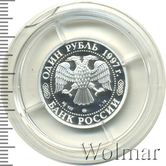 Вверху вдоль канта номинал «1 рубль» и год выпуска «1997 г.», внизу слова «БАНК РОССИИ». В середине в ободке из точек двуглавый орел под ним с внутренней стороны точечного ободка слева химическое название «Ag» и проба «925» металла, далее направо монограмма монетного двора «ММД» и чистый вес находящегося в монете драгоценного металла «7,78».