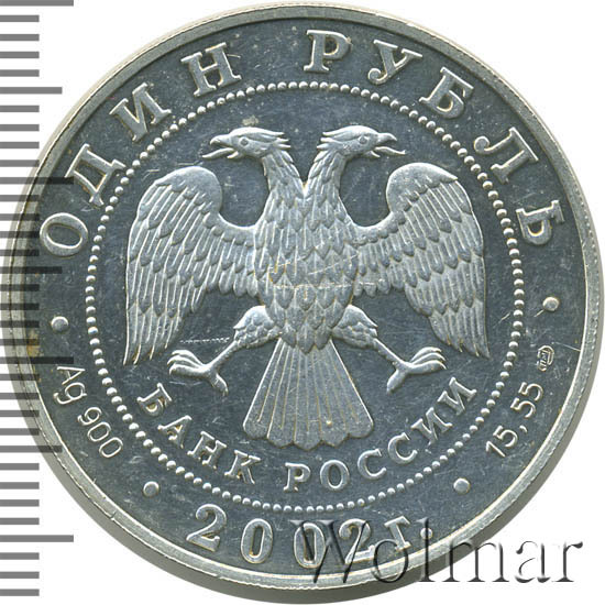 Вверху вдоль канта номинал «ОДИН РУБЛЬ», внизу слева химическое название «Ag» и проба «900» металла, внизу по центру год выпуска «2002 г.», внизу справа чистый вес находящегося в монете драгоценного металла «15,55» и монограмма монетного двора «СПМД». В середине в ободке из точек двуглавый орел под ним с внутренней стороны точечного ободка слова «БАНК РОССИИ».