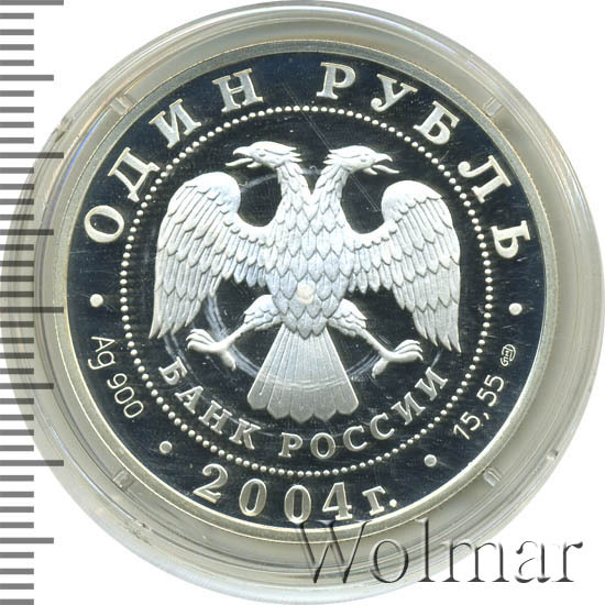 Вверху вдоль канта номинал «ОДИН РУБЛЬ», внизу слева химическое название «Ag» и проба «900» металла, внизу по центру год выпуска «2004 г.», внизу справа чистый вес находящегося в монете драгоценного металла «15,55» и монограмма монетного двора «СПМД». В середине в ободке из точек двуглавый орел под ним с внутренней стороны точечного ободка слова «БАНК РОССИИ».
