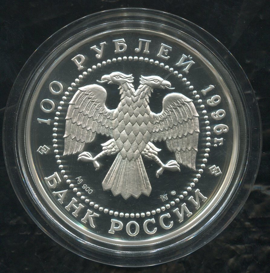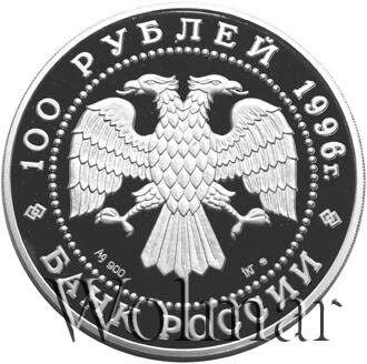 Вверху вдоль канта номинал «100 рублей» и год выпуска «1996 г.», внизу слова «БАНК РОССИИ». В середине в ободке из точек двуглавый орел под ним с внутренней стороны точечного ободка слева химическое название «Ag» и проба «900» металла, далее направо монограмма монетного двора «ЛМД» и чистый вес находящегося в монете драгоценного металла «1000,0».
