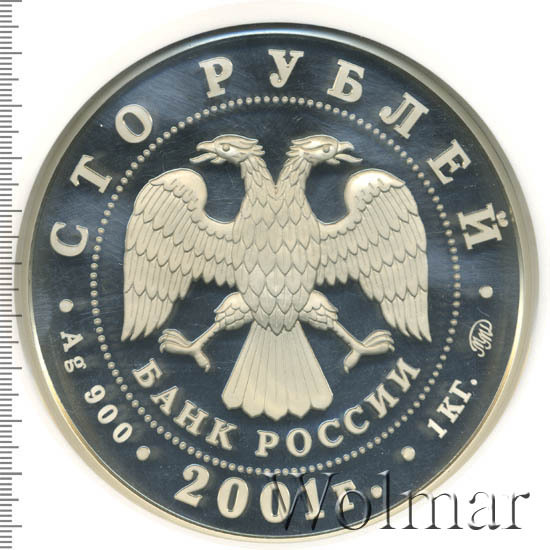 Вверху вдоль канта номинал «СТО РУБЛЕЙ», внизу слева химическое название «Ag» и проба «900» металла, внизу по центру год выпуска «2001 г.», внизу справа чистый вес находящегося в монете драгоценного металла «1000,0» и монограмма монетного двора «ММД». В середине в ободке из точек двуглавый орел под ним с внутренней стороны точечного ободка слова «БАНК РОССИИ».