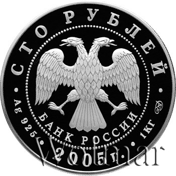 Вверху вдоль канта номинал «СТО РУБЛЕЙ», внизу слева химическое название «Ag» и проба «925» металла, внизу по центру год выпуска «2005 г.», внизу справа чистый вес находящегося в монете драгоценного металла «1000,0» и монограмма монетного двора «СПМД». В середине в ободке из точек двуглавый орел под ним с внутренней стороны точечного ободка слова «БАНК РОССИИ».