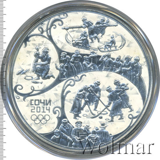 На матовом диске монеты, в центре справа - фигуры четырех мужчин с клюшками в руках, играющих в старинную русскую народную игру "Котел", вверху у канта - карусель в виде Т-образного ворота с привязанными к нему двумя санками с детьми, приводимая во вращательное движение тремя мужчинами, между игроками и каруселью - группа мужчин, женщин и детей, наблюдающих за ними, в центре слева - фигура мужчины, сидящего у лунки на льду и держащего в руках крупную рыбу, внизу у канта - группа людей в зимних одеждах, среди них - продавец газет, слева у канта - надпись "СОЧИ 2014", под ней - пять Олимпийских колец.