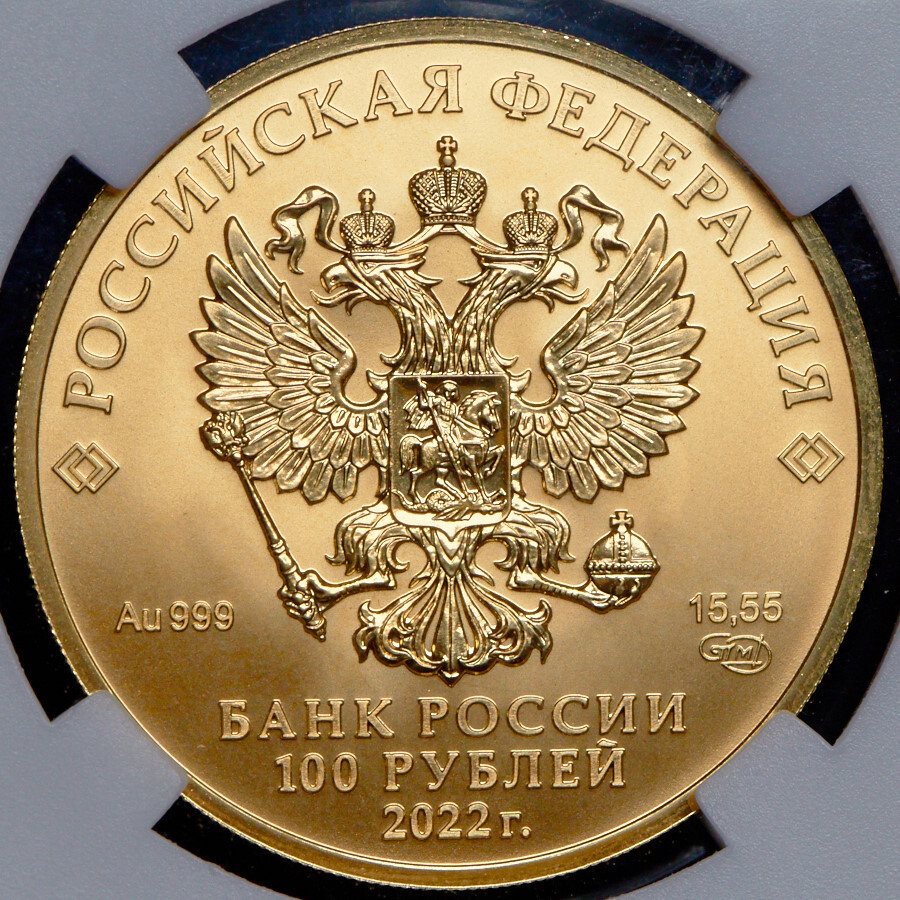 По центру изображен Государственный герб Российской Федерации, сверху вдоль канта – название страны «РОССИЙСКАЯ ФЕДЕРАЦИЯ», обрамленное с обеих сторон сдвоенными ромбами. Снизу горизонтально надпись в три строки – «БАНК РОССИИ, 100 РУБЛЕЙ, 2022 г.». Под гербом: слева – обозначения драгоценного металла и пробы сплава «Au999», справа – содержание химически чистого металла и товарный знак монетного двора «15,55 СПМД».