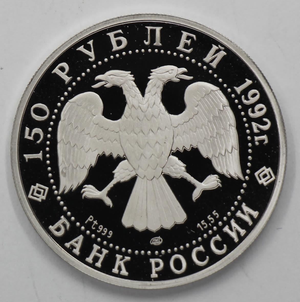 Вверху вдоль канта номинал «150 рублей» и год выпуска «1992 г.», внизу слова «БАНК РОССИИ». В середине в ободке из точек двуглавый орел под ним с внутренней стороны точечного ободка слева химическое название «Pt» и проба «999» металла, далее направо монограмма монетного двора «ЛМД» и чистый вес находящегося в монете драгоценного металла «15,55».