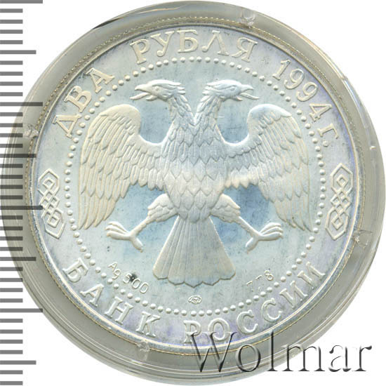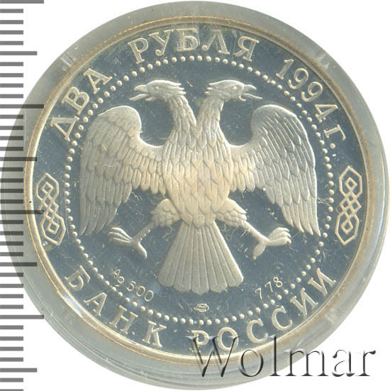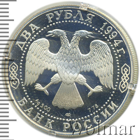 Вверху вдоль канта номинал «2 рубля» и год выпуска «1994 г.», внизу слова «БАНК РОССИИ». В середине в ободке из точек двуглавый орел под ним с внутренней стороны точечного ободка слева химическое название «Ag» и проба «500» металла, далее направо монограмма монетного двора «ЛМД» и чистый вес находящегося в монете драгоценного металла «7,78».