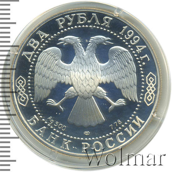 Вверху вдоль канта номинал «2 рубля» и год выпуска «1994 г.», внизу слова «БАНК РОССИИ». В середине в ободке из точек двуглавый орел под ним с внутренней стороны точечного ободка слева химическое название «Ag» и проба «500» металла, далее направо монограмма монетного двора «ЛМД» и чистый вес находящегося в монете драгоценного металла «7,78».