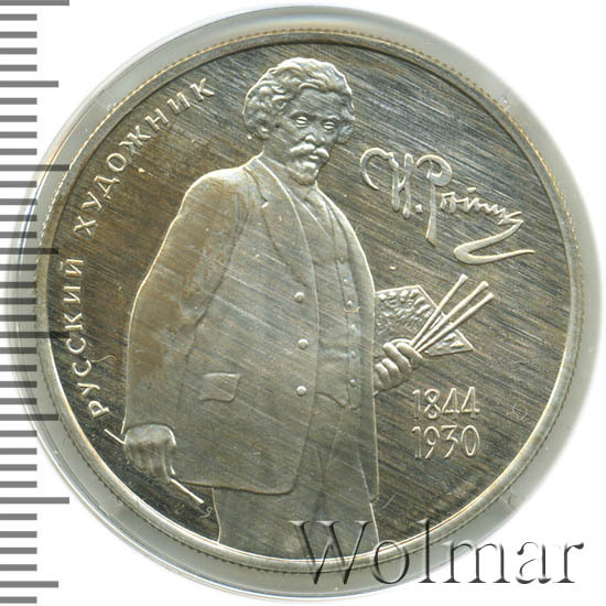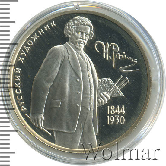 Изображение И.Е. Репина, держащего кисть в правой руке и палитру с кистями - в левой, справа - подпись-факсимиле художника, ниже - даты в две строки "1844" "1930", по окружности слева - надпись: "РУССКИЙ ХУДОЖНИК".