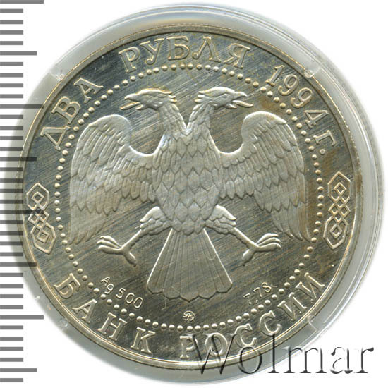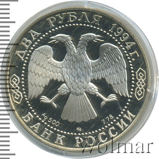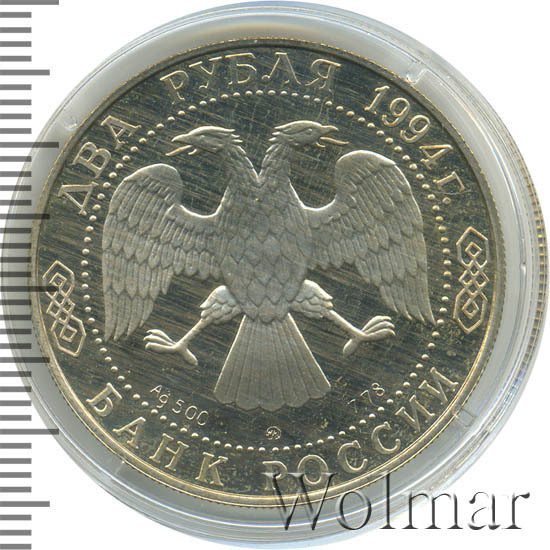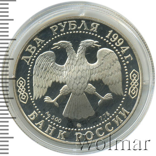 Вверху вдоль канта номинал «2 рубля» и год выпуска «1994 г.», внизу слова «БАНК РОССИИ». В середине в ободке из точек двуглавый орел под ним с внутренней стороны точечного ободка слева химическое название «Ag» и проба «500» металла, далее направо монограмма монетного двора «ММД» и чистый вес находящегося в монете драгоценного металла «7,78».