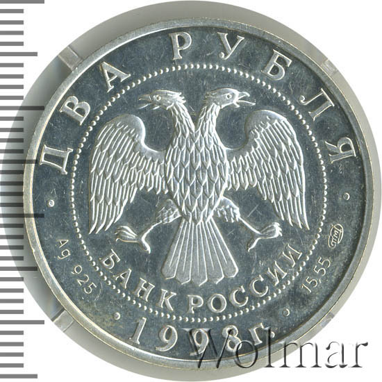 Вверху вдоль канта номинал «ДВА РУБЛЯ», внизу слева химическое название «Ag» и проба «925» металла, внизу по центру год выпуска «1998 г.», внизу справа чистый вес находящегося в монете драгоценного металла «15,55» и монограмма монетного двора «СПМД». В середине в ободке из точек двуглавый орел под ним с внутренней стороны точечного ободка слова «БАНК РОССИИ».