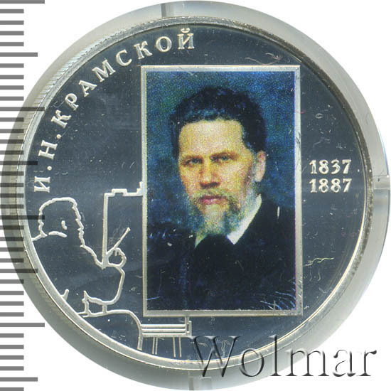 В центральной части диска монеты - цветной портрет художника в четырехугольной рамке, слева на втором плане - контурное изображение художника, рисующего на мольберте, справа от портрета - даты в две строки "1837" и "1887", слева вверху вдоль канта - надпись: "И.Н. КРАМСКОЙ".