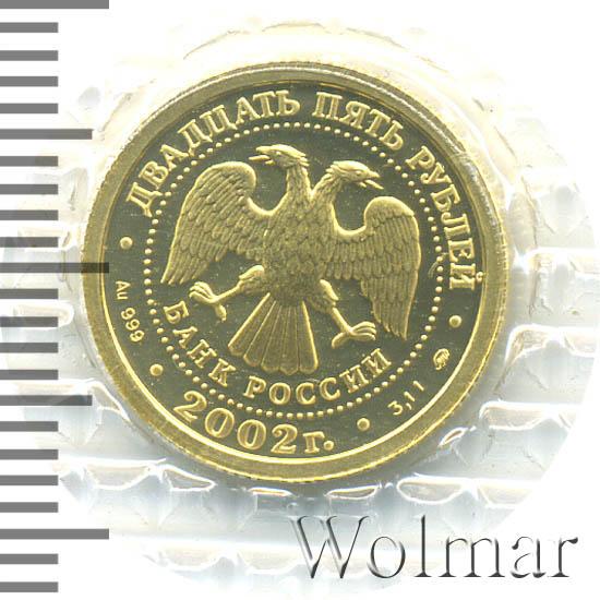 Вверху вдоль канта номинал «ДВАДЦАТЬ ПЯТЬ РУБЛЕЙ», внизу слева химическое название «Au» и проба «999» металла, внизу по центру год выпуска «2002 г.», внизу справа чистый вес находящегося в монете драгоценного металла «3,11» и монограмма монетного двора «ММД». В середине в ободке из точек двуглавый орел под ним с внутренней стороны точечного ободка слова «БАНК РОССИИ».