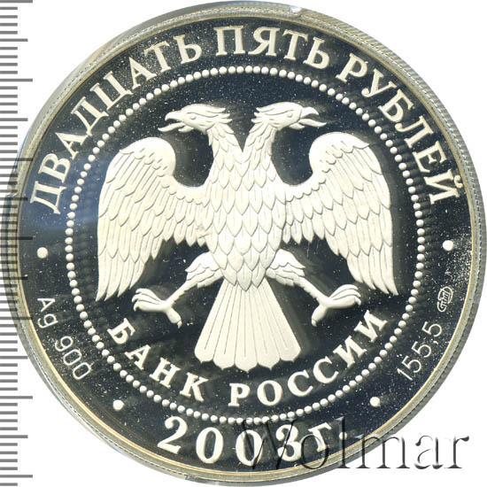 Вверху вдоль канта номинал «ДВАДЦАТЬ ПЯТЬ РУБЛЕЙ», внизу слева химическое название «Ag» и проба «900» металла, внизу по центру год выпуска «2003 г.», внизу справа чистый вес находящегося в монете драгоценного металла «155,50» и монограмма монетного двора «СПМД». В середине в ободке из точек двуглавый орел под ним с внутренней стороны точечного ободка слова «БАНК РОССИИ».