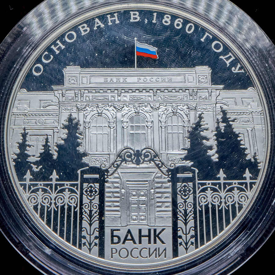 Изображение фасада центрального корпуса здания Банка России в Москве с узорчатой оградой и елями перед ним, над зданием - цветное изображение Государственного флага Российской Федерации, вверху вдоль канта по окружности - надпись: "ОСНОВАН В 1860 ГОДУ", внизу - надпись в две строки: "БАНК РОССИИ".