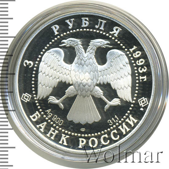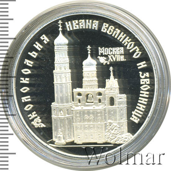 Реверс монеты 3 рубля 1993 года ЛМД колокольня proof