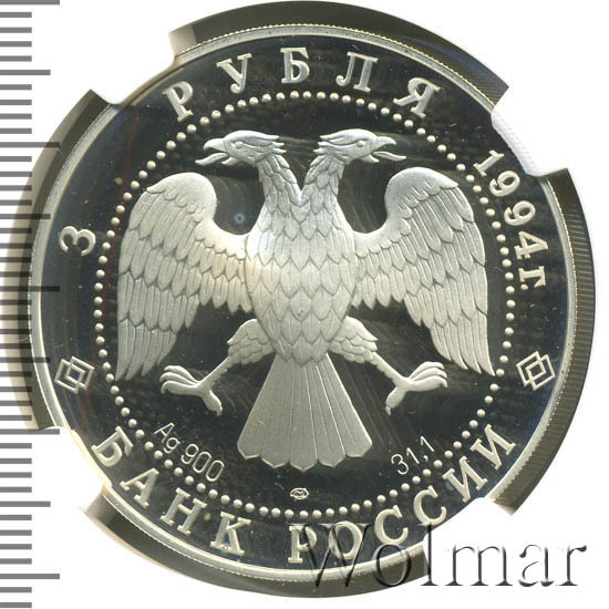 Вверху вдоль канта номинал «3 рубля» и год выпуска «1994 г.», внизу слова «БАНК РОССИИ». В середине в ободке из точек двуглавый орел под ним с внутренней стороны точечного ободка слева химическое название «Ag» и проба «900» металла, далее направо монограмма монетного двора «ЛМД» и чистый вес находящегося в монете драгоценного металла «31,10».