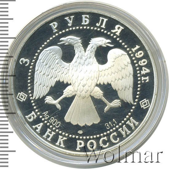 Вверху вдоль канта номинал «3 рубля» и год выпуска «1994 г.», внизу слова «БАНК РОССИИ». В середине в ободке из точек двуглавый орел под ним с внутренней стороны точечного ободка слева химическое название «Ag» и проба «900» металла, далее направо монограмма монетного двора «ЛМД» и чистый вес находящегося в монете драгоценного металла «31,10».