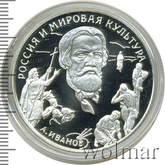 Портрет А.А. Иванова на фоне фрагмента его картины "Явление Христа народу"(Явление Мессии): слева - Иоан Креститель, на втором плане справа - Иисус Христос, ниже - палитра с кистями, по окружности - надписи: вверху - "РОССИЯ И МИРОВАЯ КУЛЬТУРА", внизу - "А. ИВАНОВ".