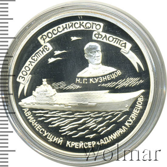 Изображение авианесущего крейсера "Адмирал Кузнецов", справа над ним - портрет адмирала Н.Г. Кузнецова, под ним - надпись полукругом: "Н.Г. КУЗНЕЦОВ", по окружности - надписи: вверху на ленте - "300-ЛЕТИЕ РОССИЙСКОГО ФЛОТА", внизу - "АВИАНЕСУЩИЙ КРЕЙСЕР "АДМИРАЛ КУЗНЕЦОВ".