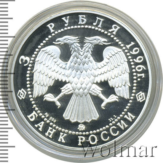 Вверху вдоль канта номинал «3 рубля» и год выпуска «1996 г.», внизу слова «БАНК РОССИИ». В середине в ободке из точек двуглавый орел под ним с внутренней стороны точечного ободка слева химическое название «Ag» и проба «900» металла, далее направо монограмма монетного двора «ММД» и чистый вес находящегося в монете драгоценного металла «31,10».