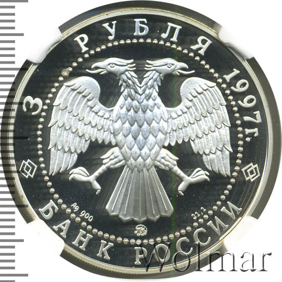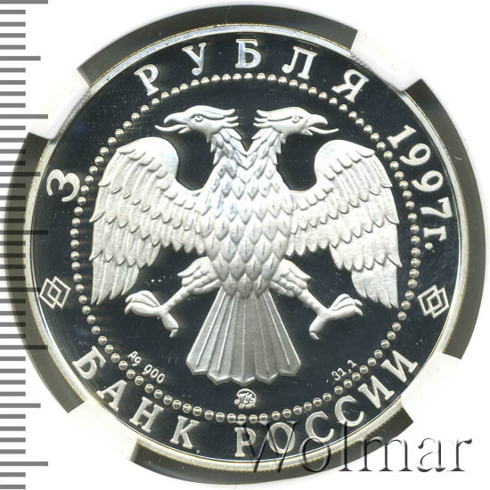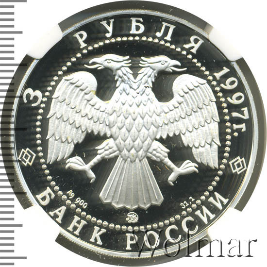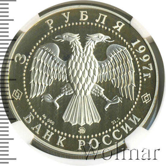 Вверху вдоль канта номинал «3 рубля» и год выпуска «1997 г.», внизу слова «БАНК РОССИИ». В середине в ободке из точек двуглавый орел под ним с внутренней стороны точечного ободка слева химическое название «Ag» и проба «900» металла, далее направо монограмма монетного двора «ММД» и чистый вес находящегося в монете драгоценного металла «31,10».