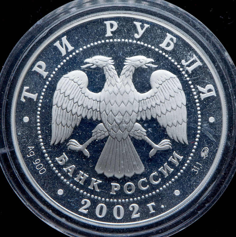 Вверху вдоль канта номинал «ТРИ РУБЛЯ», внизу слева химическое название «Ag» и проба «900» металла, внизу по центру год выпуска «2002 г.», внизу справа чистый вес находящегося в монете драгоценного металла «31,10» и монограмма монетного двора «ММД». В середине в ободке из точек двуглавый орел под ним с внутренней стороны точечного ободка слова «БАНК РОССИИ».
