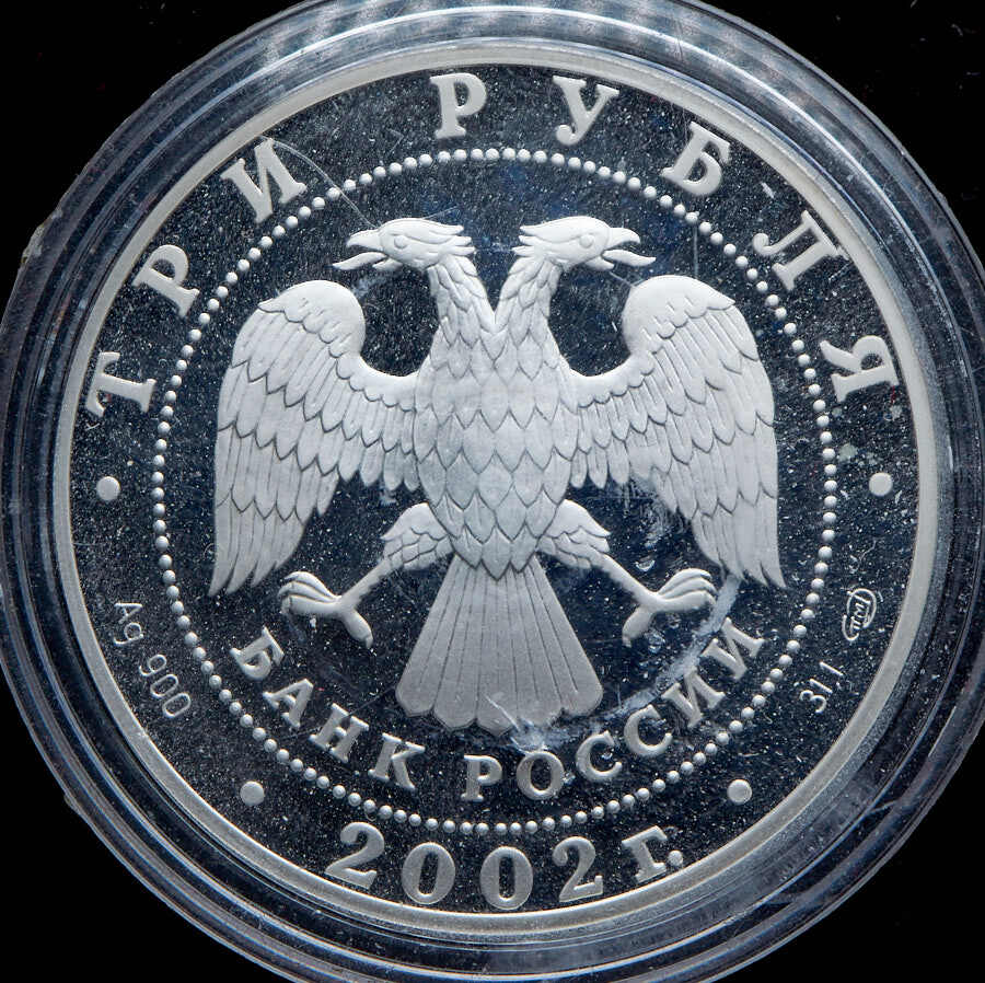 Вверху вдоль канта номинал «ТРИ РУБЛЯ», внизу слева химическое название «Ag» и проба «900» металла, внизу по центру год выпуска «2002 г.», внизу справа чистый вес находящегося в монете драгоценного металла «31,10» и монограмма монетного двора «СПМД». В середине в ободке из точек двуглавый орел под ним с внутренней стороны точечного ободка слова «БАНК РОССИИ».