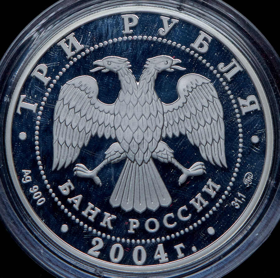 Вверху вдоль канта номинал «ТРИ РУБЛЯ», внизу слева химическое название «Ag» и проба «900» металла, внизу по центру год выпуска «2004 г.», внизу справа чистый вес находящегося в монете драгоценного металла «31,10» и монограмма монетного двора «ММД». В середине в ободке из точек двуглавый орел под ним с внутренней стороны точечного ободка слова «БАНК РОССИИ».