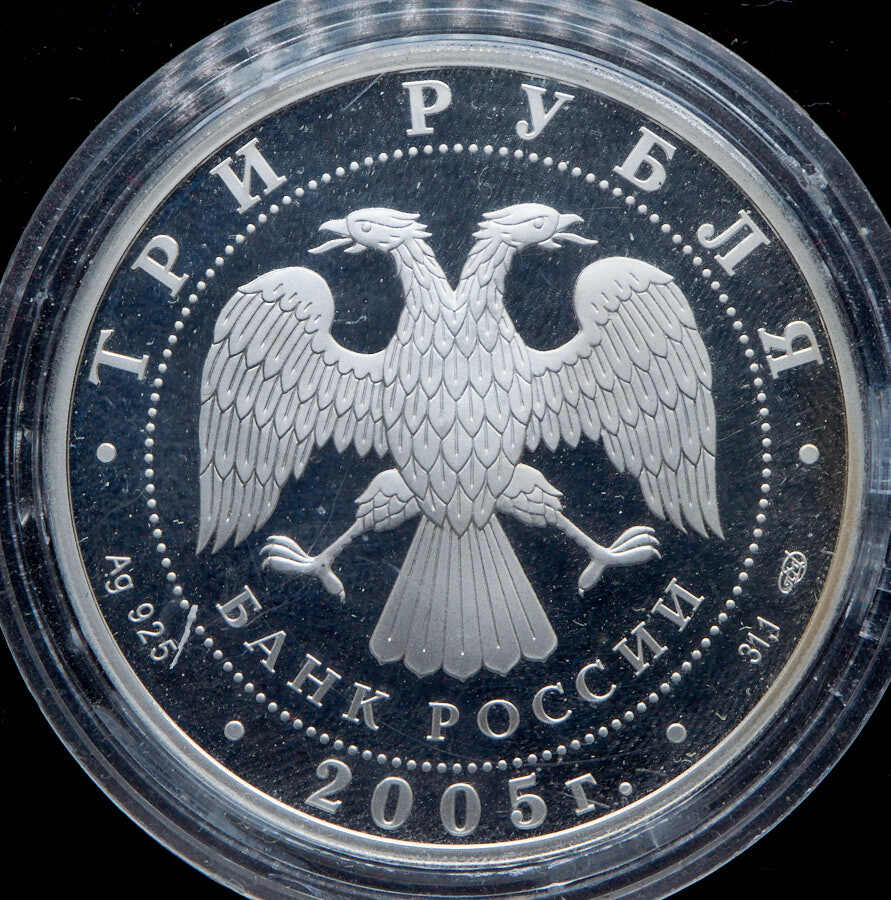 Вверху вдоль канта номинал «ТРИ РУБЛЯ», внизу слева химическое название «Ag» и проба «925» металла, внизу по центру год выпуска «2005 г.», внизу справа чистый вес находящегося в монете драгоценного металла «31,10» и монограмма монетного двора «СПМД». В середине в ободке из точек двуглавый орел под ним с внутренней стороны точечного ободка слова «БАНК РОССИИ».