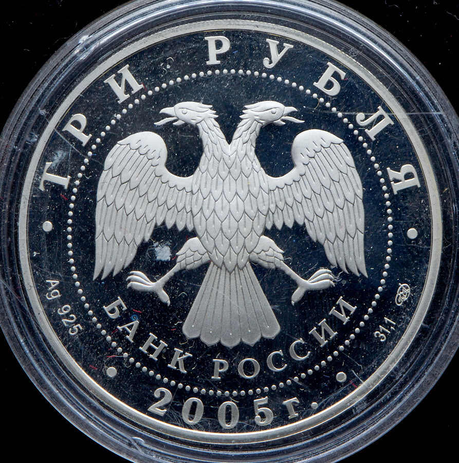Вверху вдоль канта номинал «ТРИ РУБЛЯ», внизу слева химическое название «Ag» и проба «925» металла, внизу по центру год выпуска «2005 г.», внизу справа чистый вес находящегося в монете драгоценного металла «31,10» и монограмма монетного двора «СПМД». В середине в ободке из точек двуглавый орел под ним с внутренней стороны точечного ободка слова «БАНК РОССИИ».