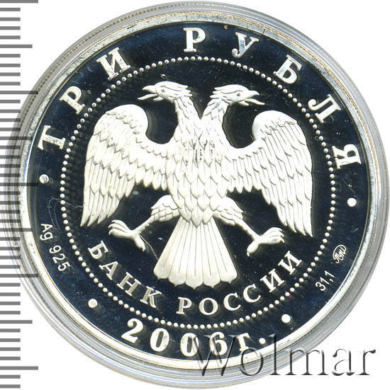 Вверху вдоль канта номинал «ТРИ РУБЛЯ», внизу слева химическое название «Ag» и проба «925» металла, внизу по центру год выпуска «2006 г.», внизу справа чистый вес находящегося в монете драгоценного металла «31,10» и монограмма монетного двора «ММД». В середине в ободке из точек двуглавый орел под ним с внутренней стороны точечного ободка слова «БАНК РОССИИ».