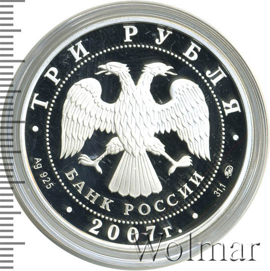 Вверху вдоль канта номинал «ТРИ РУБЛЯ», внизу слева химическое название «Ag» и проба «925» металла, внизу по центру год выпуска «2007 г.», внизу справа чистый вес находящегося в монете драгоценного металла «31,10» и монограмма монетного двора «ММД». В середине в ободке из точек двуглавый орел под ним с внутренней стороны точечного ободка слова «БАНК РОССИИ».