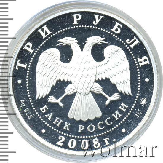 Вверху вдоль канта номинал «ТРИ РУБЛЯ», внизу слева химическое название «Ag» и проба «925» металла, внизу по центру год выпуска «2008 г.», внизу справа чистый вес находящегося в монете драгоценного металла «31,10» и монограмма монетного двора «ММД». В середине в ободке из точек двуглавый орел под ним с внутренней стороны точечного ободка слова «БАНК РОССИИ».