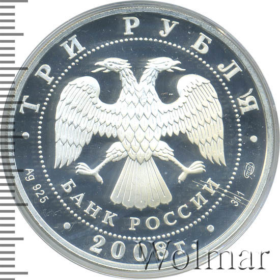 Вверху вдоль канта номинал «ТРИ РУБЛЯ», внизу слева химическое название «Ag» и проба «925» металла, внизу по центру год выпуска «2008 г.», внизу справа чистый вес находящегося в монете драгоценного металла «31,10» и монограмма монетного двора «СПМД». В середине в ободке из точек двуглавый орел под ним с внутренней стороны точечного ободка слова «БАНК РОССИИ».